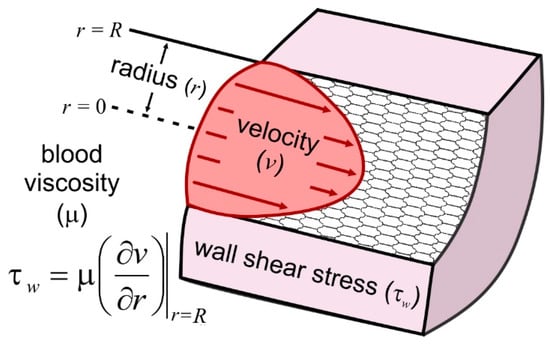 The figure provides an illustration of the velocity profile experienced by endothelial cells lining an artery as a result of blood flow, and a general expression for wall shear stress (τw; WSS). In its simplest form, WSS can be defined as the frictional force imposed on the blood vessel wall. For this simple case, WSS is the product of viscosity (μ) and the shear rate, which is also known as the rate of deformation or near-wall velocity gradient (∂v/∂r). Adapted from Samyn and LaDisa [52].