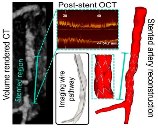Given the importance of geometry in the simulation process and WSS calculations reviewed above, it is not surprising that multiple approaches have been developed for the reconstruction of coronary arteries used in computational simulations [69,70,71,72,73], many of which using OCT data have recently been reviewed by Chiastra et al. [74]. We previously developed methods [73] to create patient-specific coronary artery reconstructions by combining conventional extravascular and high-resolution intravascular imaging. Our work in this area has featured the fusion of CTA with OCT data, but the conventional imaging data source could also be MRI or biplane angiography. Biplane (i.e., orthogonal) angiographic images are often used to determine the intravascular imaging pathway and have also been used to reconstruct a vessel lumen. Although biplane angiography is a common clinical process that is performed during PCI, non-orthogonal views, differences in data acquisition between planes, movement resulting from cardiac and/or respiratory dynamics, visibility of the imaging device, and general image quality are potential issues that may arise with this approach. Our approach (Figure 2) uses the conventional extravascular imaging data to establish boundaries for an optimization routine that determines the mathematical location of the intravascular imaging wire during pullback. The intravascular images provide high-resolution information from within the stented region, thereby theoretically permitting the use of volumes generated from biplane imaging planes despite the limitations mentioned above. Besides OCT, the high-resolution data can also come from IVUS. Both modalities can capture stent linkages. OCT has 10x the resolution of IVUS but requires contrast, and therefore some interventional cardiologists prefer IVUS. Our reconstruction and stenting approaches work with data from either modality. Briefly, intravascular images are processed to isolate lumen versus stent contours (i.e., segments) by thresholding. The pathway traversed by the wire during pullback is calculated by minimizing the total bending energy [73] within the volume delineated by the extravascular imaging data. Lumen segments are then registered longitudinally on the wire pathway using landmarks and according to the intravascular image spacing. These lumen segments are oriented such that they are orthogonal to the wire pathway and rotated so that the centroids are aligned with the vessel centerline. The aligned and oriented segments are then loaded into SimVascular for lofting and blending. The implanted DES from post-stenting OCT or IVUS is quickly replicated in reconstructions by a series of Boolean operations [66,73] or structural finite element modeling (FEM) [46]. Similar to full-scale structural FEM simulations that include stent recoil, the series of Boolean operations implemented for this approach can capture local stent malapposition.