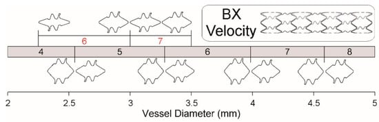 Comparing diameter ranges of a commercial stent vs. its diameter ranges for optimal WSS. The number of repeating units from the manufacturer’s sizing matrix is shown (red values) with that from optimization using a TAWSS cost function (black values). The geometry of one unit for the limits of each range is also shown. Adapted from Gundert et al. [112].