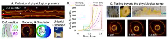 In an effort to address requests for additional material characterization studies related to atherosclerotic coronary arteries, our group has begun testing plaques obtained from fresh human coronary arteries, which were harvested after the untimely passing of patients. These arteries are obtained as part of an organ donation protocol at a partnering institution. OCT imaging was performed at 0–90 mmHg and the physiologic blood pressure noted in the associated documentation. In our initial protocol, the arteries were then dissected for uniaxial extension testing and characterized using a hyperelastic constitutive model [124]. Cauchy stress was expressed as a function of the Green–Lagrange Strain. To create a validated computational approach and to characterize plaques too small to test empirically, inverse finite element analysis simulations were performed using the displacement from OCT at each pressure (Figure 4A). There was good agreement within the physiological range between the stress–strain curves obtained experimentally and those from inverse finite element analysis simulations (green square within Figure 4B), but there were large deviations in the super-physiological (beyond physiological) range of loading imposed during stenting (red square in Figure 4B). To mitigate this issue, biaxial material testing is now implemented to better represent in vivo loading during stenting (Figure 4C). Moreover, to translate this ex vivo loading approach beyond the physiological range to the clinic, a specialized angioplasty balloon that accommodates the OCT imaging wire has been fabricated. Deformations throughout each artery are captured via OCT at pressures according to an associated compliance table, and inverse finite element analysis simulations are again performed, yielding a constitutive characterization of the tissue across the strain range applied during PCI. Results with these methods are helping fill the void in the literature for plaque types alone and in combination, which may ultimately permit a pre-stenting plaque morphology assessment that could influence the DES choice to mitigate poor outcomes by further exploiting imaging in vivo.