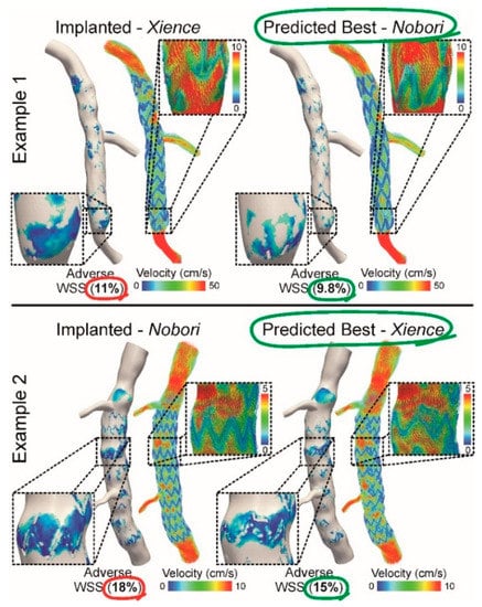 CFD simulations showing the amount of adverse WSS and near-wall velocity for two patients who may not have received the optimal DES according to CFD. Red circled percentages underscore more adverse areas of low WSS relative to green circled percentages for each example. These examples reveal how geometric perturbations for a given patient can factor into adverse WSS and may correlate with NH.