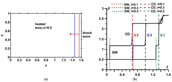 Figure 3 demonstrates the analysis of the possibilities of the applied numerical code for the resolution of shock waves and contact surfaces (shear layers). The “quasi-one-dimensional” Riemann problem of the decay of an arbitrary discontinuity was chosen for validation. The statement of the problem is schematically shown in