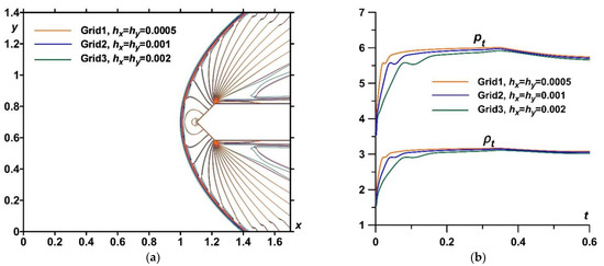 Figure 4b) obtained using these three difference grids. The number of nodes of Grid1 and Grid3 differ by 16 times, and the number of nodes of Grid1 and Grid2 by four times, but nevertheless, one can see that the values at the apex of the body differ from their theoretical values less than by 2% (for Grid1). Additionally, the positions and shapes of the bow shock waves almost coincide (see