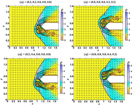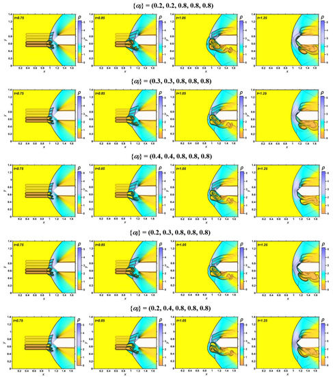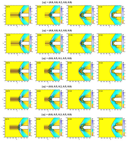 The first and second lines of images demonstrate the dynamic of the originated vortex structures, which are caused by the sets of layers {αj} with a heated central layer. One can see the dynamic of a complicated shock structure with two vortices with the decreased density accompanying the Richtmyer-Meshkov instability. The front of the bow shock wave undergoes a significant transformation. As the stratified region of the energy source passes, the diffraction of the shock wave occurs, accompanied by the formation of two symmetrical triple configurations (t = 0.85). During the passage of the stratified pulse, one can see the curvature of the bow shock wave (t = 1.05), which is greater the smaller the value of α3 (or the higher temperature) in the central layer. After the passage of the stratified pulse, the flow returns to the undisturbed steady mode. These results are consistent with the results of numerous studies on the effect of a heated longitudinal region on a bow shock wave.