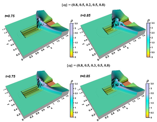 t = 0.85). After the passage of the stratified pulse, the instabilities weaken, and the front of the bow shock wave is restored, retaining the asymmetric shape (