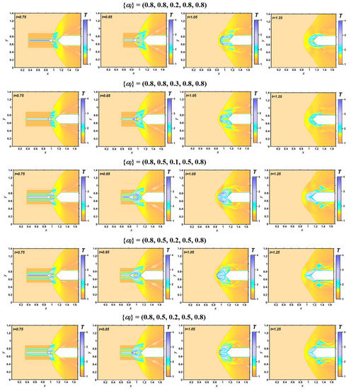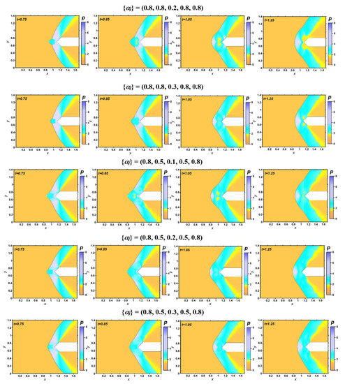 t = 1.25). At the end of the process, when the impulse leaves the computational area, the flow returns to its original unperturbed state. Comparing the flow patterns for different sets of {