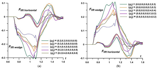 Figure 13a,b, accordingly. It can be seen that the lift (pitch) forces are defined mostly by the wedge part of the body