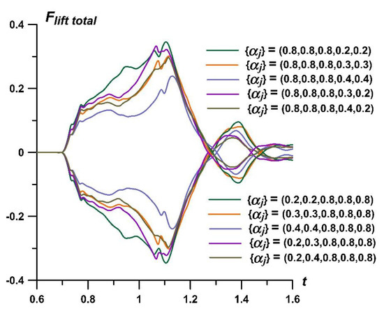 Figure 14, the dynamics of unsteady lift (pitch) forces for different asymmetric sets {