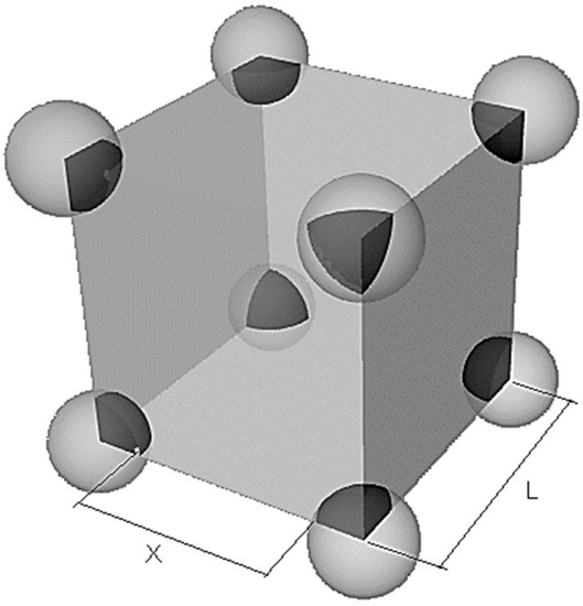 The work of Liang, Hong and Fan [19] looked at three particles co-aligned and at separation distances up to 7 particle diameters, which corresponds to a particle volume fraction of approximately 10−3. In order to extend this work to investigate the effects at lower concentration values, 10−4, which is common in many dilute phase industrial flows, a full CFD study of this work was undertaken. The aim of this study was to produce a new drag force relation that considered the influence of particle concentration as well as particle Reynolds number. The new relation needed to be a generic equation which relied on the particle concentration or particle volume fraction, α, because the Lagrangian particle tracking method tracks individual representative isolated particles without considering the position of surrounding particles. An assumption was made that because no particle position is actually known, the particles in any given cell are evenly distributed in a cubic formation, see Figure 1. Utilising this assumption, the volume fraction can be transformed into particles separated by a uniform distance in all directions.