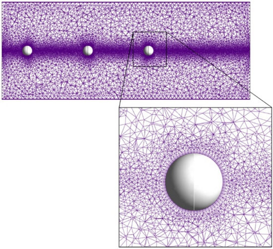 The experimental work of Liang, Hong and Fan [19] was used in the present work for numerical method. In their work, four different orientations were investigated. The first considered the effect of varying angle with respect to the flow direction at given separation distance. The second configuration looked a three co-aligned particle in the flow direction. The third test case considered a central test particle surrounded by 6 equally spaced particles in hexagonal configuration. The final case looked at a central test particle surround by 8 particles in cubic orientation. As previously mentioned the three co-aligned particles work forms the basis of the following study whereby separation distances from 0.25 to 7 x/d were investigated where the results for 0–3 x/d were compared with the experimental data of [19]. The published results considered the flow conditions where the particle Reynolds number equalled 54. The set up consists for the CFD model replicates those dimensions seen in the experimental work, with a pipe diameter of 15.24 cm and a particle diameter of 1.58 cm. The particles are co-aligned along the centreline of the pipe. The present CFD geometry based on the [19] experiments and inlet velocity profile is given in Figure 3. Figure 4 shows a section through the mid-plane of the pipe highlighting the mesh densities used. The mesh for these simulations was unstructured for the bulk of the domain, but regions close to the pipe wall and particle surfaces were structured in nature. These are the areas of greater gradients of flow variables. Beyond the structured region, heavy unstructured refinement was enforced around the particle surfaces and along the centreline of the pipe as this are the regions of most interest and the areas where the greater velocity gradients occur. To obtain an acceptable accuracy with acceptable computational time, various grid independency tests were conducted with different mesh resolutions. The predicted results were verified to have been no significant impact of the grid resolution on the results. A time step of 0.01 s was used in the present model.