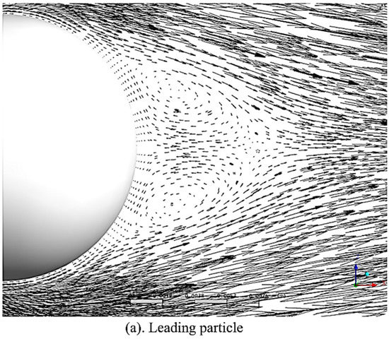 Figure 7 shows a close-up view of the recirculation area behind the three particles. The leading particle, due to the higher incoming velocity, has a larger recirculation area and results in higher drag forces. Due to the close agreement of the predicting ability of the CFD model, it is valid to assume an accurate extension of this work could be undertaken.