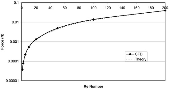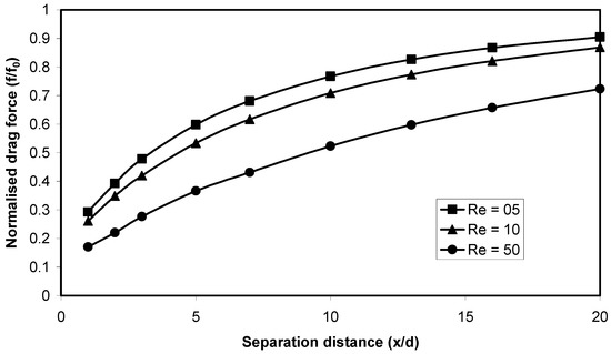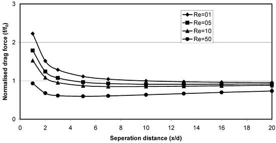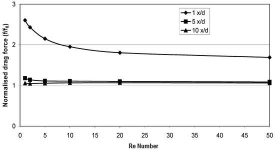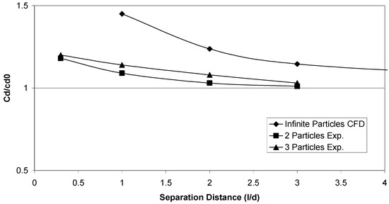 The increased drag force attributed to the squeezing of the flow or the ‘nozzle’ effect was also noted by Chen and Lu [30]. In their experimental work, the drag force on 2 and 3 particles positioned side-by-side in the oncoming flow were measured. Their results suggest that at smaller separation distances, the drag force increases, which they primary conclude is based on the nozzle effect, which causes a rise in local Reynolds numbers. Although there is some difference in the magnitude of force increase between the predicted CFD results and those of the experimental work (see, Figure 14), it is noticeable from their work, that the case of three particle yielded slightly higher drag force increase compared with those of the two-particle case. With this in mind, the infinite array of particles perpendicular to flow in these CFD predictions would naturally expect to produce higher drag forces due to introduction of additional particles.