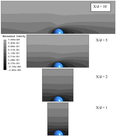 Velocity contour plots of Model 2 for separation distances x/d = 10, 5, 2 and 1 at Re = 50.