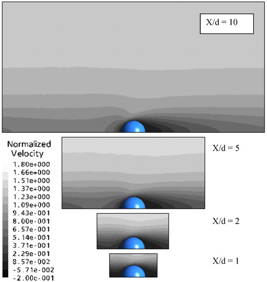 The velocity contour plots of Figure 15 show how the smaller separation distance greatly increases the maximum normalized velocity. The case of separation distance of 10 x/d shows almost a constant normalized velocity of close to unity resulting in a drag force ratio of approximately the same magnitude. This highlights the importance of the “nozzle” effect on the drag force for the smaller geometries caused by close neighbouring particles.