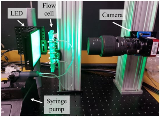 An optical setup was used to measure and track the motion and deformation of a bubble passing through a pore geometry is shown in Figure 2. The setup consists of two main sections of an imaging system containing a camera (4M180, IO Industries Inc., London, UK), a light source (BX0404-520 nm; Advanced Illumination Inc., Rochester, VT, USA), and data acquisition (DVR Express Core 2, IO Industries Inc., London, UK) [,,]. The second section, the flow loop, consisted of two syringe pumps for each phase (PHD 2000, Harvard Apparatus, Holliston, MA, USA) and a flow channel, as highlighted in the figure.
