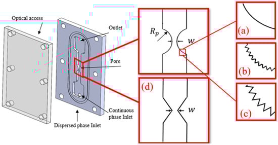 The motion of the multi-phase flow in the pore space was studied by modeling the pore space of two adjacent particles in the flow channels. Four different pore geometries were designed as shown in the detailed views of Figure 3. These pore geometries are a smooth circular pore, circular pore with two different roughness (0.2 and 0.4 mm), and a sharp pore. In these channels, two cylindrical pillars were used to mimic the geometry of two adjacent particles in the pore space with smooth surfaces. The diameter pillars () were 2 mm and they were separated by w = 1 mm at the pore throat. The detail view (a) of Figure 3 represents the design of the smooth circular pore. Two different roughness of 0.2 and 0.4 mm, shown in the detail view (b) and (c), were used to compare the effect of roughness. A sharp pore geometry with the same aperture was also considered to account for the effect of the change of the convergence of the pore on the pressure distribution. In this case, two adjacent rectangles were considered as shown in the detail view (d). For all cases, the depth of the channel was 3 mm. Figure 4 shows the pictures of the pore geometries after manufacturing on the left for each pore geometry and their corresponding original designs are shown on the right.