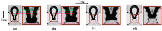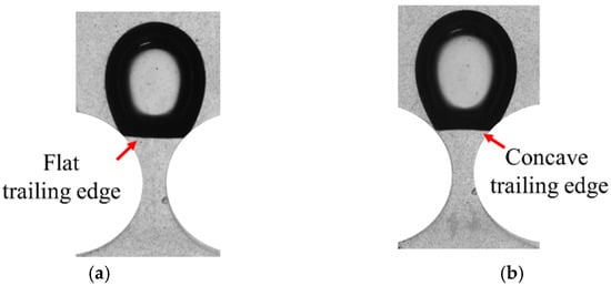 A series of images showing the passage of the bubble and its deformation for bubbles having a similar equivalent radius (radius of bubble, 3 mm) passing through the different pore geometries are shown in Figure 6. The images were selected based on the location of the centroid of the projected area of the bubble from the pore throat to highlight the bubble shape at these locations for the different surface conditions. As shown in location (a) for all pore geometries, the bubbles are symmetric and have a similar radius of the curvature of leading and trailing edges. They are slightly oval at this position due to the presence of a confining wall effect on the bubble’s interface as was reported in []. The results of the pressure calculation for the bubble passage are unique for the current experiment due to the presence of the confining wall. As the size of the bubble considered in this study is same, the results of the trend of the change in the pressure and the radius of curvature is general and can be applied for any confining geometry condition.