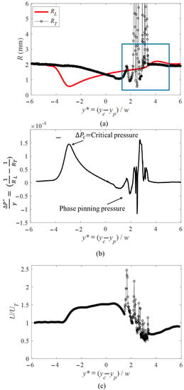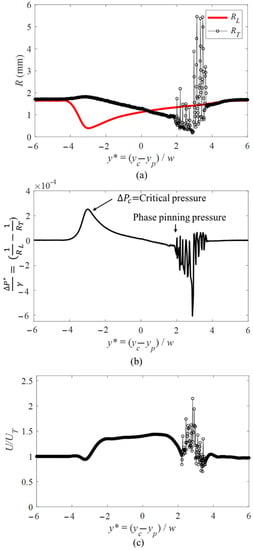 A sample of a raw image of a bubble and the surrounding fluid passing through a circular pore is shown in Figure 5a. The images are collected in the mid-plane of channel to evaluate the deformation of the bubble in the symmetry plane. The bubble is reflected as a black hollow region as shown in the picture due to the difference between the refractive indexes of glycerol and air. To have better detection of the deformation of the bubble and remove noise of the background, the images need to be pre-processed. The details of these procedures can be seen in [,,]. The deformation of the dispersed phase in the pore geometry will be then detected by the radius of the leading and trailing edge at each location as shown in Figure 5c. Having the curvature of the leading and trailing edges, the pressure change across the bubble can be evaluated using Equation (1).
