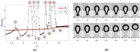 The effect of the pore roughness identified by the change in the radius of curvature of a bubble passing through a circular pore with 0.4 mm roughness is shown in Figure 11a. A similar trend of the change in the radius of curvature detected for the case of 0.2 mm roughness. The number of the detected peaks of the change in curvature is lower due to the lower number of the pore roughness objects. The variation of the radius is higher due to the stronger interaction of the bubble and solid interface. The bubble interface shape changes from convex to concave which results in discontinuities in the instantaneous change of the radius of curvature.