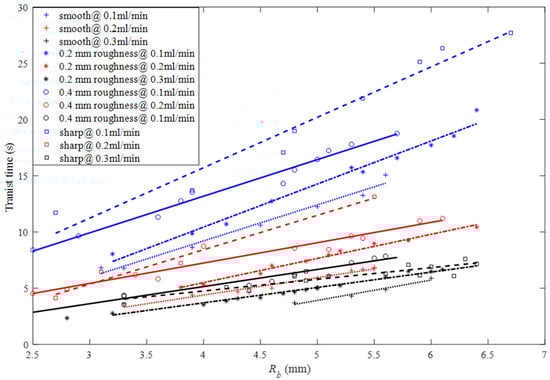 The variation of the transit time required for bubbles of different sizes passing through different pore geometries is represented in Figure 14. The transit time in this study is the measured time required for the bubble leading edge to enter the pore structure and the trailing edge to exit the pore structure determined from image analysis obtained using the optical setup. The overall trend of the change in the transit time at the same flow rate in the confined geometry is represented by the fitted line for each collected data set.