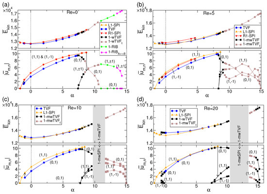 Bifurcation diagrams for various vortex structures versus for (a) , (b) , (c) , and (d) . Shown are top (time-averaged) modal kinetic energy (Equation (11)) and bottom the dominant (time-averaged) radial flow field amplitudes at mid-gap contributed from the modes as indicated. Vertical arrows indicate the transition when one flow becomes unstable.