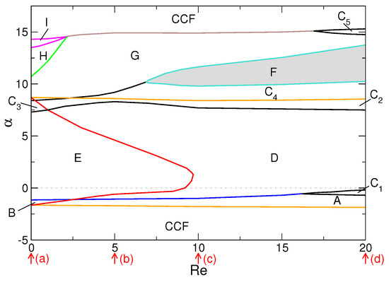 These idealizations lead to a unique basic state, i.e., Circular Couette flow (CCF) which depends only on r. The system has symmetry, where is the group of arbitrary rotations about the axis and is the group containing the reflection at any height z and translations in z direction. The mean, possibly zero, axial flux remains unchanged along the radial direction. All symmetries (Equation (4a,4b,4c)) are conserved with only the radial profiles of the CCF basic state depending on the parameter .