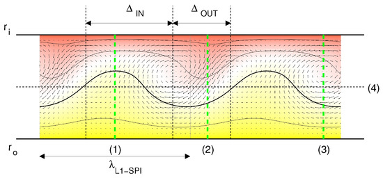 Schematics illustrating the main flow positions exemplarily shown on a L1-SPI (, ): (1) inflow; (2) outflow; (3) vortex core; (4) mid-gap; regime of inflow [outflow] (); : inner [outer] cylinder radius.