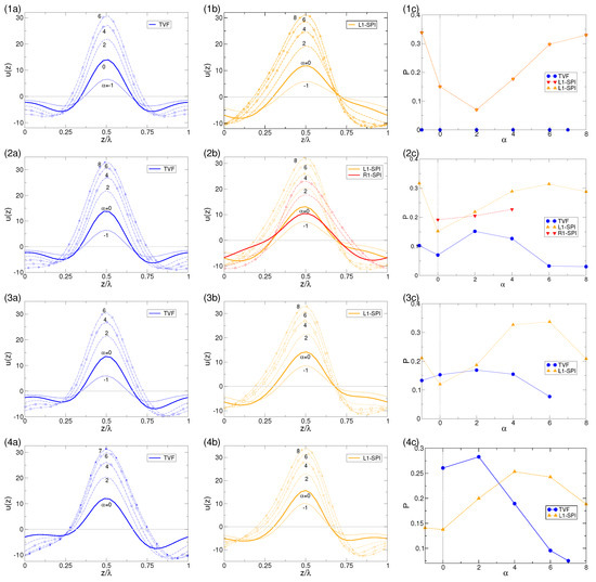 In contrast to TVF, the helical SPIs are already asymmetric for (in Figure 6(1b) only L1-SPIs are presented, as R1-SPIs have identical properties for ). Either inward directed radial flow as well as a moderate outward radial flow increases the asymmetry P of L1-SPI. Only for sufficiently strong the asymmetry parameter P decreases (Figure 6c) and L1-SPI becomes more symmetric again. This is a similar effect as seen for TVF and can be explained by the fact that with larger the flow structures (e.g., velocity profiles) are pushed towards the outer cylinder. As a result, there is less space in radial direction to allow for different (re-)circulation in the bulk. Qualitatively, R1-SPI (here only stable existing for with ) illustrates the same behavior, whereby the magnitude and range of the velocity profiles are smaller compared with L1-SPI. This can be explained by the direction of , which is opposite directed to the natural propagating direction of R1-SPI. Thus, R1-SPI is fighting against the wind of resulting in only a small stable range in (see also Figure 2).
