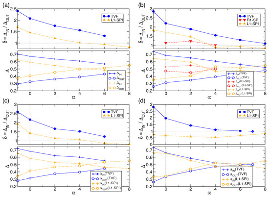 Increasing initially slightly decreases for both TVF and L1-SPI, while strongly increases for larger .
