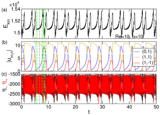 The main dynamics during the transition from L1-SPI toward 1-mwTVF (Figure 11) can be described as breakup and reconnection process of vortex pairs in the axial direction (see also Figure 12). First, the vortex pairs of L1-SPI start to meander and relocate in its axial position (direction), while moving closer together, which results in stretch and compression in the annulus. With increasing time, this oscillation and compression increase with the result that two vortex pairs of different levels connect and eventually breakup. Finally, the sections of the broken vortex pairs re-connect at the same level, forming the toroidally closed vortex structure 1-mwTVF. This process repeats as long as no other external parameters, e.g., or are changed. Heteroclinic connections between different solutions are not uncommon and has been studied in various systems [48,49,50,51,52] in the past. As clearly visible in Figure 10, the modal kinetic energy shows two peak maxim during one period. The first at the formation of 1-mwTVF (Figure 12 between (3)–(4)) and the second at the elimination of 1-mwTVF, respectively. Both energy maxima appear at the points of breakup in the vortex structures. First, when the helical vortex structure breaks up (L1-SPI to 1-mwTVF) and second when the toroidal vortex structure breaks up (1-mwTVF to L1-SPI). As expected, at these points, the variations in are also the largest.