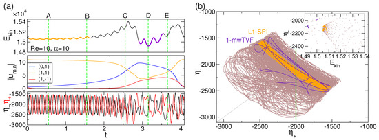 (a) Extraction of Figure 10 illustrating one single period of the heteroclinic connection (hco). (b) Phase portrait in plane (see text for further description). Exemplarily, orange and violet colors indicate the L1-SPI and 1-mwTVF, respectively, extracted from longtime sequence (brown color) of the flow dynamics (same color code is used in (a,b)). The inset shows the corresponding Poincaré section for (vertical green line in ()). The dashed green lines with labels (A)–(E) illustrate time steps for which flow visualizations are shown in Figure 12. Control parameters: , .