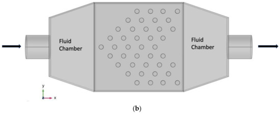 Based on the model presented in Figure 1a, the full Navier Stocks equations were solved for the fluid region and the energy equation for the entire model. The flow is assumed Newtonian, and the flow rate is low to remain in the laminar regime. The fluid flow equations in the three-dimensional form are as follows: