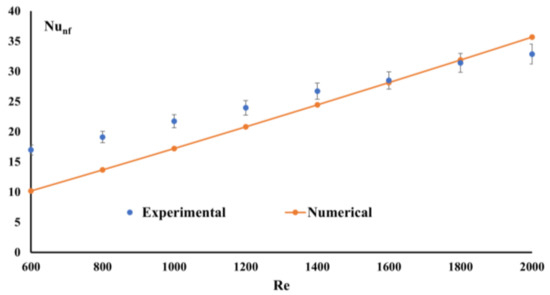 The temperature measurements are done at the base of the pin-fins, and the nanofluid Nusselt number is measured experimentally. The flow rate represented by the Reynolds number varied between 600 and 2000. As shown in Figure 3b, the pin-fins have a particular, uniform arrangement in the diagonal position. The problem was solved numerically to check the accuracy of the numerical model used in this analysis. Figure 4 displays the average nanofluid Nusselt number as a function of the Reynolds number for a nanofluid having a 0.013% MXene concentration. As shown, the slope of the Nusselt number gradient is similar between the two methods, and the data shows an excellent agreement. The definition of Nusselt number for nanofluid could be found in reference [30].