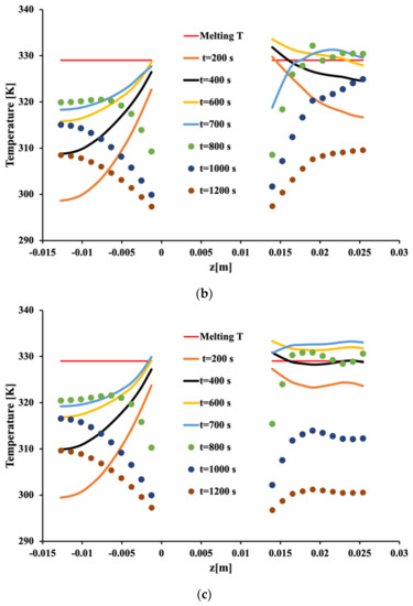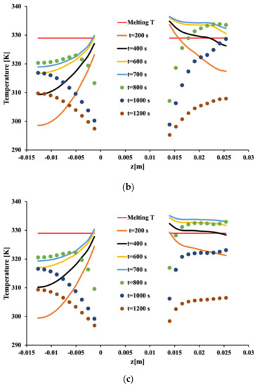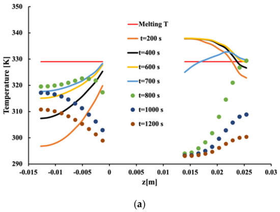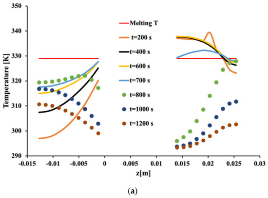 Figure 8 and Figure 9 present the temperature variation in the middle of the model, starting from the bottom PCM block to the top PCM block. Thus, the variation is along the z direction by maintaining the x and y coordinate fixed at (x,y) equal to (0.001875-m,0-m), respectively. Figure 7 presents the case in the presence of the pin-fins. The straight red line corresponds to the melting temperature of the PCM under study. In the presence of gravity, one may notice that the bottom PCM block is heated from the top, and the top PCM block is heated from the bottom. Thus, one expects a pure diffusion mechanism for the bottom PCM block and a natural convection for the top PCM block. The dotted temperature line corresponds to the temperature variation during discharge, and the complete lines correspond to the temperature during the charging period. As shown in Figure 8a, at a low Reynolds number, most of the PCM is molten at the top block, and the block is in a mushy condition at the bottom. Natural convection indeed helped in distributing the heat in the top block. As the flow rate represented by the Reynolds number increases further, the melting PCM increases, and thus the top block is mainly molten. However, in the bottom block, no molten PCM is observed. The high flow rate can achieve strong natural convection, and energy is well stored in the PCM.