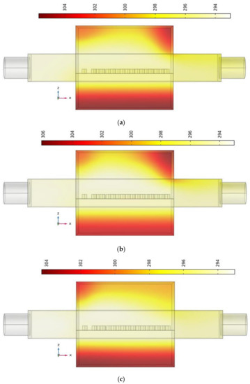 Another way to observe the temperature variation in the middle section of the system is to display the iso-temperature surfaces in the middle of the model, as shown in Figure 10 and Figure 11. In Figure 10, the results are displayed at the end of the charging time at t = 700 s. Figure 10a shows the case when the Reynolds number equals 50. As seen, a natural convection is present at the top PCM block and the pure diffusion mechanism at the bottom PCM block. A convective pattern exists where natural convection exists, and uniform temperature distribution is in the diffusion part. As the Reynolds number increases, one may notice an increase in heat transportation, as shown in Figure 10b,c. The rotating cells at the corner of the PCM block are reduced as the Reynolds number increases. During the discharge period, heat removal is observed, as shown in Figure 10. One may notice that the heat accumulated at the PCM corner takes a longer time to be released due to the low thermal conductivity of the PCM. At a time of t = 1400 s, some remaining heat trapped at the corner of the phase change material is clearly shown. However, the pin-fins were able to assist in removing heat as well as adding heat, whether it was in the charging or discharging period.