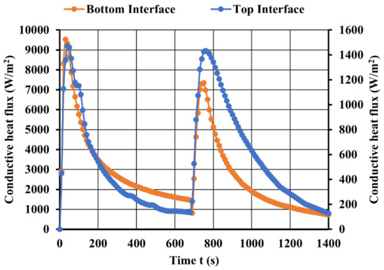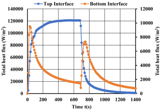 The reason for more heat at the top of the PCM instead of the bottom PCM is investigated further by calculating the heat fluxes at the top and bottom interfaces. Figure 13 and Figure 14 display the heat flux at the interfaces during charging and discharging. The top interface is located at the intersection between PCM and the top boundary of the flow region, and the bottom interface is located at the base of the pin-fins. This total heat flux is composed of conductive heat flux and convective heat flux. The flow rate in question corresponds to a Reynolds number of 50. During the charging process, an equal amount of heat is conducted to both interfaces. During the discharge period, the top interface releases heat faster due to the natural convection. Figure 14 shows the total heat flux, including conductive and convective heat flux. One can notice a greater heat flux for the top PCM than for the bottom interface. The reason is that the presence of pin-fins created a vigorous mixing in the flow by reflecting the heat to the top interface. This can demonstrate the reason for high energy storage in the top PCM. Implementing pin-fins can assist in transferring the heat in a fast way.