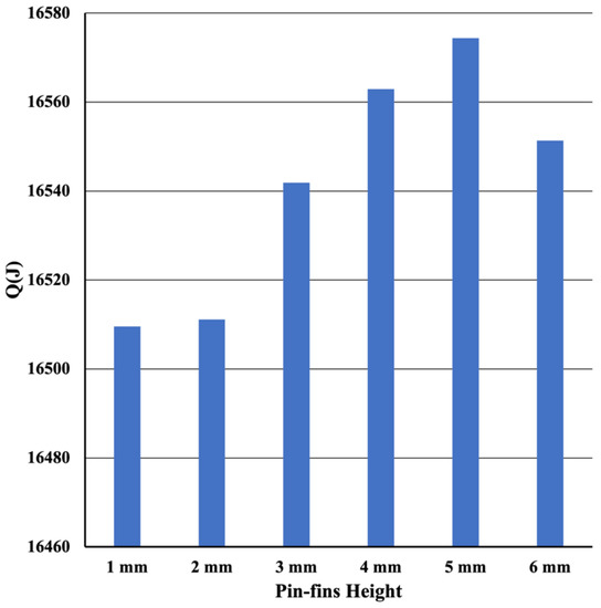 Figure 15 presents the total heat stored in the phase change material by calculating Q during the charging period over the time from zero seconds to 700 s. As shown, as the pin-fins height increase, the heat transfer improves, and since the mixing is increased, a large heat flux is deflected toward the top phase change material block. What is interesting from this graph is that it appears that an optimum height is obtained equal to 5 mm. As the pin-fins height further increases, the pin-fins performance decreases. It is believed that this is due to the flow behavior.