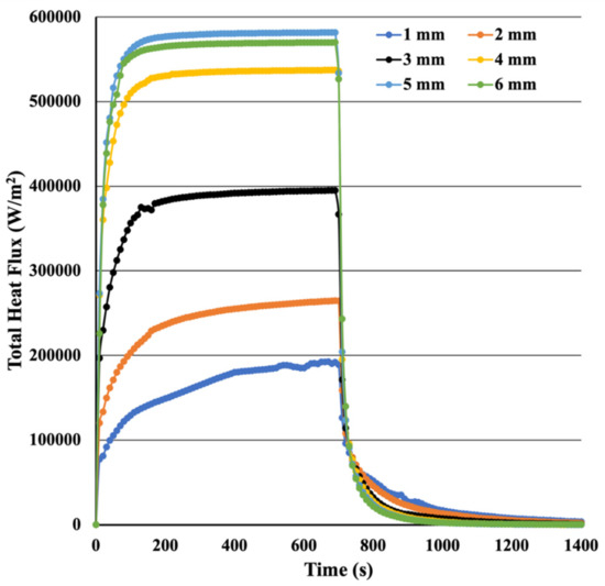 To investigate this finding further, Figure 16 presents the total heat flux at the top interface during charging and discharging. It is evident that after a pin-fins height of 5 mm, the total heat flux becomes constant and occupies a smaller area as a function of time. If this flux is integrated over the charging period only, Figure 17 presents the average total heat flux. Indeed at a pin-fins height of 6 mm, the heat flux drops in magnitude as predicted by calculating the energy stored in the phase change material. As indicated earlier, most heat transfer activities occur at the top block of the phase change material, and gravity enhances this heat transfer by natural convection.