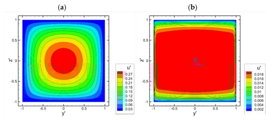 Distribution of the non-dimensional axial velocity in a constant plane for Hachannel = 0 (a) and Hachannel = 50 (b).