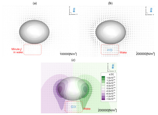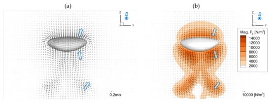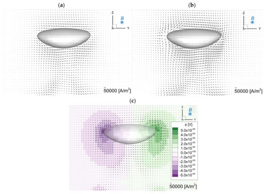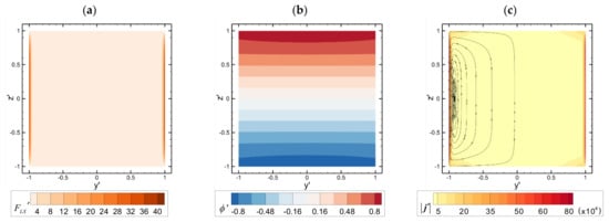 Normalized distributions of (a) the Lorentz force in the x-direction , (b) the electric potential and (c) the magnitude of the electric current density , and the electric current vector (lines drawn only in the left half of the domain for clarity).