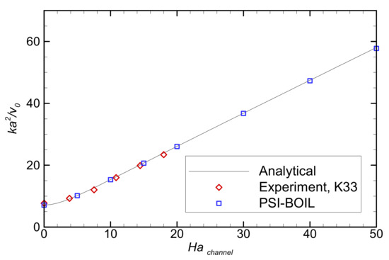where a is the half-width of the channel, and B0 is the intensity of the imposed magnetic field. In the K 33 experiment, measurements were undertaken over the range of 0 ≤ Hachannel ≤ 18. Note that we performed simulations over the wider range of 0 ≤ Hachannel ≤ 50 in order to compare them with not only the experiment but also with the analytical solution [38].