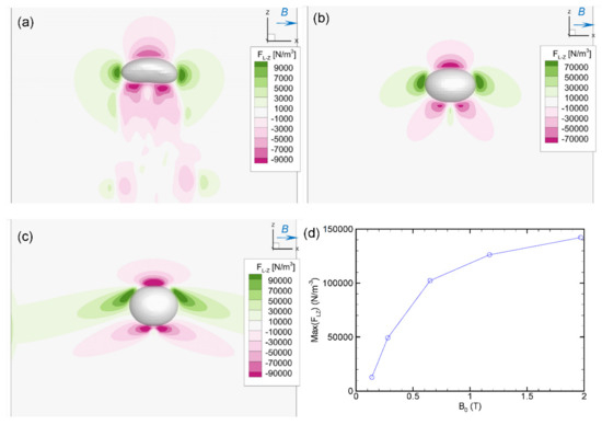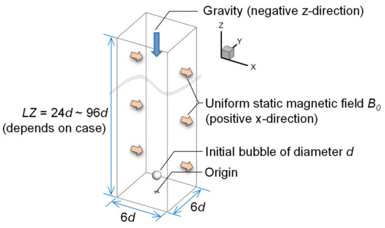 Figure 6 shows the orientation of the coordinate system, the boundaries of the computational domain, the initial bubble size and the direction of the applied magnetic field. Both the x- and y-axes are horizontal, and the z-axis points upward with the origin at the center of the bottom plane. A uniform and static magnetic field, B0, was applied in the positive x-direction. The domain width was 6d × 6d, where d is the diameter of the initial spherical bubble. The height of the domain, LZ, was set in such a way that a pseudo-steady-state could be obtained for the bubble rise velocity in all cases. In practical terms, this translated as LZ = 24d for the simulation cases with B0 > 0 and LZ = 48d or 96d for the cases in which B0 = 0. The domain width 6d × 6d is the same as the simulation setup of Jin et al. [17]. In this paper, we simulated the bubbles in the range of 1.12 ≤ Eo ≤ 3.67, and the domain width 6d × 6d corresponds to 19 × 19 mm2 for Eo = 1.12 and 34 × 34 mm2 for Eo = 3.67, which is smaller than the experimental setup of 60 × 60 mm2 [7] but which has a similar order of dimension. The walls surrounding the computational domain were assumed to be non-slip for the velocity field (, where is the wall normal vector), and they were also assumed to be electrically insulating (). A spherical bubble was initially placed with its center at the coordinate (0, 0, 2d) above the center of the bottom face in the stagnant liquid GaInSn. The computational grid consisted of uniform cubes, and a fixed grid was used, i.e., neither a moving grid nor a grid refinement technique was employed.
