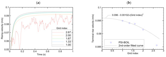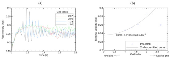 where and are the z-coordinates of the bubble centroid at times t1 and t2, respectively. For the case of GB-0, t1 and t2 were set to 0.6 s and 0.8 s, respectively, and the grid dependency of the time-averaged velocity is displayed in Figure 7b. The terminal velocity for the coarsest grid was considered to be out of the asymptotic region, and the second-order fitted curve was drawn neglecting this “rogue” result. Note that all the data points are not exactly on the fitted curve because the simulations presented here were unsteady, which made the estimation of the discretization error more challenging than those of the steady flow simulations due to time discretization errors, as mentioned in the review paper of Eça, et al. [41]. The asymptotic behavior indicates that the order of accuracy in space is indeed close to being second-order, on the basis of the fitted curve.