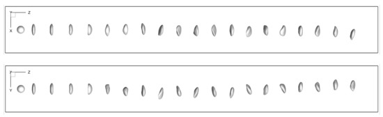 Here, Vi and zi are the volume and z-coordinate of the computational cell center indexed i, respectively, and ncells is the total number of cells. The rise velocities did not attain steady-state conditions for all the grids adopted, since the bubble shape evolved with time, and the trajectories were not strictly vertical, as shown in Figure 8. The time-averaged rise velocity was calculated as follows: