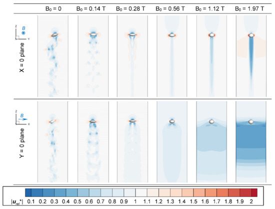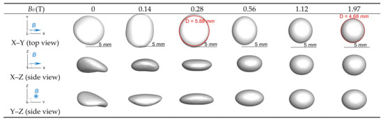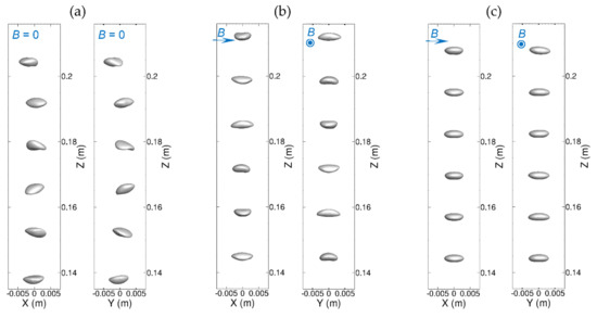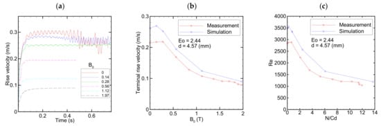Further MHD simulations for single rising bubbles under HMF conditions were performed by Jin, et al. [17]. The simulations were related to argon bubbles (1 < Eo < 6) rising in GaInSn for 0 ≤ B < 0.5 T. In the same year, Zhang, et al. [18] also published simulations of single rising bubbles in an HMF, with the ranges in this case being 2.2 ≤ Eo ≤ 4.9 and 0 ≤ N ≤ 24, where N is the Stuart number. In both works [17,18], the terminal rise velocity was predicted to monotonically decrease with increases in the magnetic field, i.e., the nonlinear behavior measured by Mori, et al. [1] for a VMF was not observed in the case of an HMF.