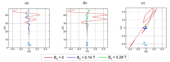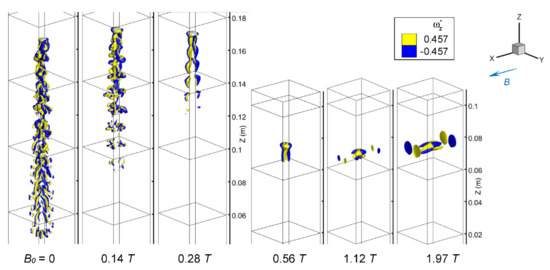 Very recently, Zhang, et al. [19] presented MHD simulations for both HMF and VMF orientations to better understand the influence of the applied magnetic field on the trajectories of the rising bubbles. The results showed that the spiral motion of a bubble observed for a zero magnetic field changed to a purely zig-zag motion under the influence of an HMF. To understand the mechanism, they analyzed the evolution of the wake vortices and the forces to which they were subjected. According to their simulation results, oscillations in the bubble trajectory are suppressed in the direction of the applied magnetic field vector.