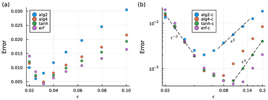 Note that the two integrals above are actually equivalent; one can show this fact by integrating the second integral by parts and using the properties of the smoothing factor (20). The near error field analysis of Nguyen and Cortez [34] produced a similar correction condition that . Indeed, this condition can be shown to be equivalent to (25) by using (A3). Note that (25) is purely a property of the smoothing factor and does not depend on the geometry of the boundary.