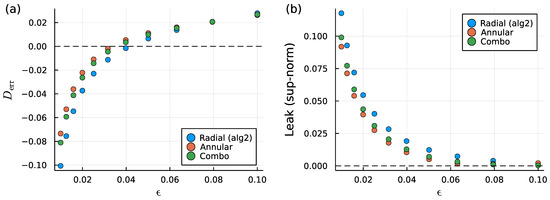 A detailed far-field error analysis by Zhao et al. [37] of the flows produced by general blob functions shows that a potential dipole generally dominates the error for ; this error is regardless of how quickly decays. To achieve better accuracy, an explicit correction is needed to eliminate the potential dipole contribution, with the corrected blob having a vanishing second moment. In our framework, an explicit far-field correction is unnecessary; as shown in (A4) in Appendix A, the second moment of vanishes identically whenever vanishes at a sufficient rate. In particular, we find from (A2) that, if