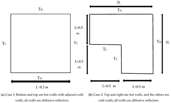 Both geometries are shown in Figure 1. In case 1, the cavity is a 2-D square shape, with a side length of L. Opposite walls are at the same temperature, i.e., the top and bottom sides are hot at 1500 K, with adjacent cold walls at 300 K. Case 2 is a rectangular bend, with the top and right side hot, with a temperature of 1500 K, and the other walls are cold, with a temperature of 300 K. Both cases use a diffuse reflector for all borders as a boundary condition. We defined the Knudsen number in the introduction, and it is λ/L in this paper.