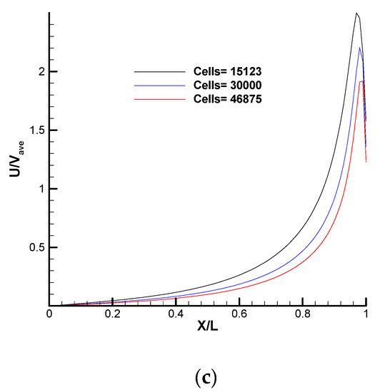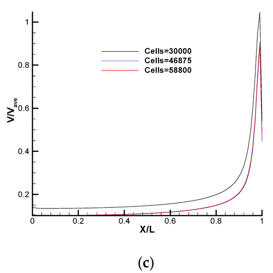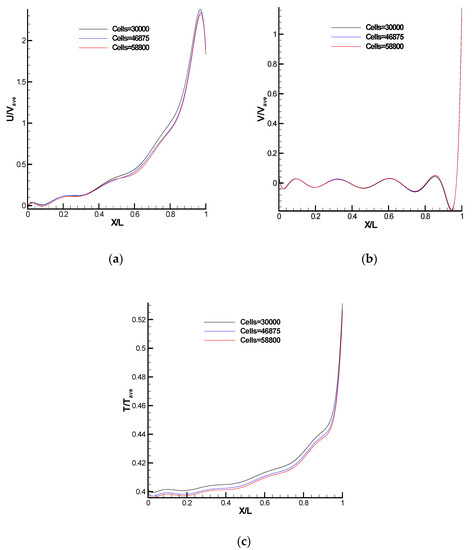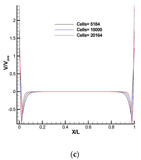 In case 2, the rectangular bend geometry was divided into small areas using structured cells. In the rectangular bend’s cold side, normalized velocity components in the x and y directions and temperature are shown in Figure 3 at Kn = 0.1. We used three different grid sizes, with maximum cell sizes of 0.1λ, 0.08λ, and 0.07λ; i.e., grids of 30,000, 46,875, and 58,800 cells. The velocity in the direction of x, y, and temperature were normalized to average velocity and average temperature, respectively. The frames in this figure show the nearly identical results for three grid sizes; thus, a grid with 30,000 cells was used to solve case 2.